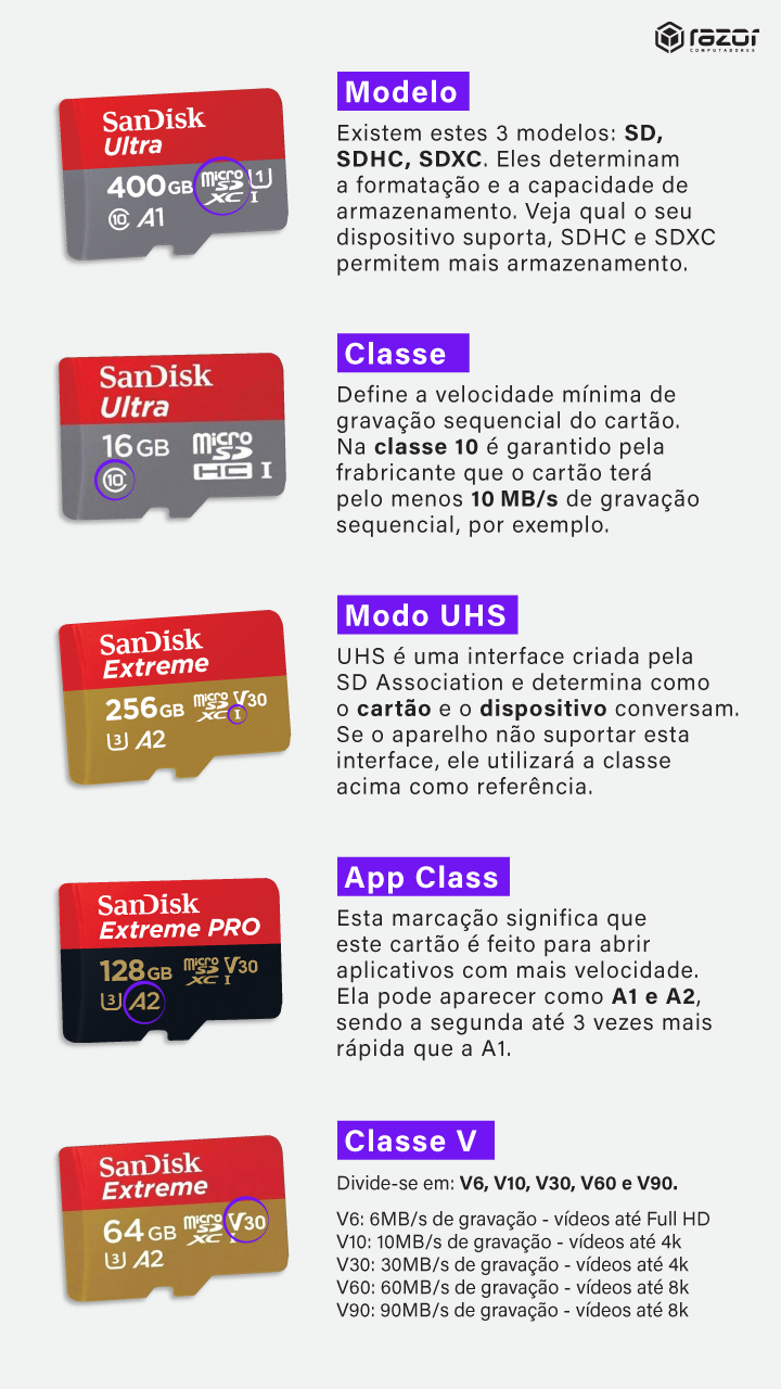 As diferenciações dadas aos cartões são referentes ao máximo de armazenamento de cada modelo.
