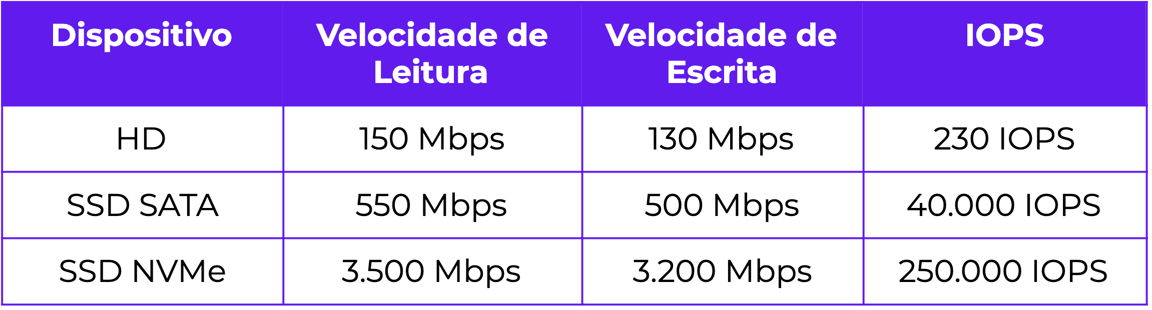 Sua principal vantagem é o acesso 10x mais rápido a informações do que as mídias magnéticas e seu IOPS é quase 150x maior do que um disco rígido dando um salto de desempenho nos desktops. Os SDDs têm diferentes conexões, como SATA, mSATA, PCIe e M.2, que irão diferenciar a velocidade de acesso e leitura destes dispositivos de armazenamento.