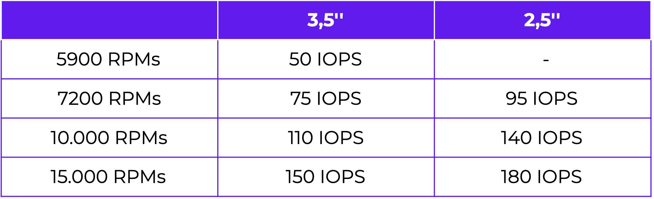 Alguns exemplos são os antigos disquetes, assim como os atuais HDs (hard disk), sendo uma das formas mais seguras de armazenar informações, isso pela ampla possibilidade de recuperar informações no caso de acidentes, como quedas, por exemplo. Abaixo é possível conferir os números de IOPS (Input/Output per Second) médios dos HDs disponíveis no mercado: