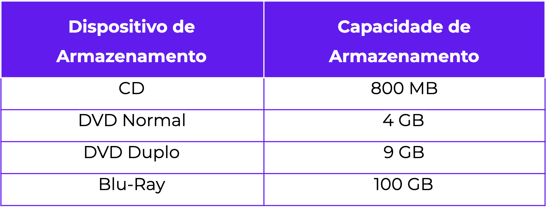 O armazenamento óptico consiste na leitura de dados através de um laser de alta precisão disparado sobre a superfície da mídia. Alguns exemplos são os CD’s (Compact Disc), DVD’s (Digital Versatile Disc) e Blu-Rays. A capacidade do primeiro chega a 800 MB, o segundo tem até 9 GB de armazenamento, enquanto o blu-Ray pode chegar até 100 GB.