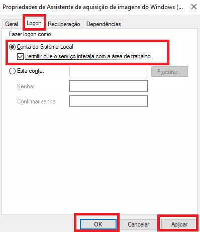 6: Na guia Logon , selecione a opção Conta do Sistema Local. Marque a caixa ao lado de Permitir que o serviço interaja com a área de trabalho e clique em Aplicar e depois OK para continuar.