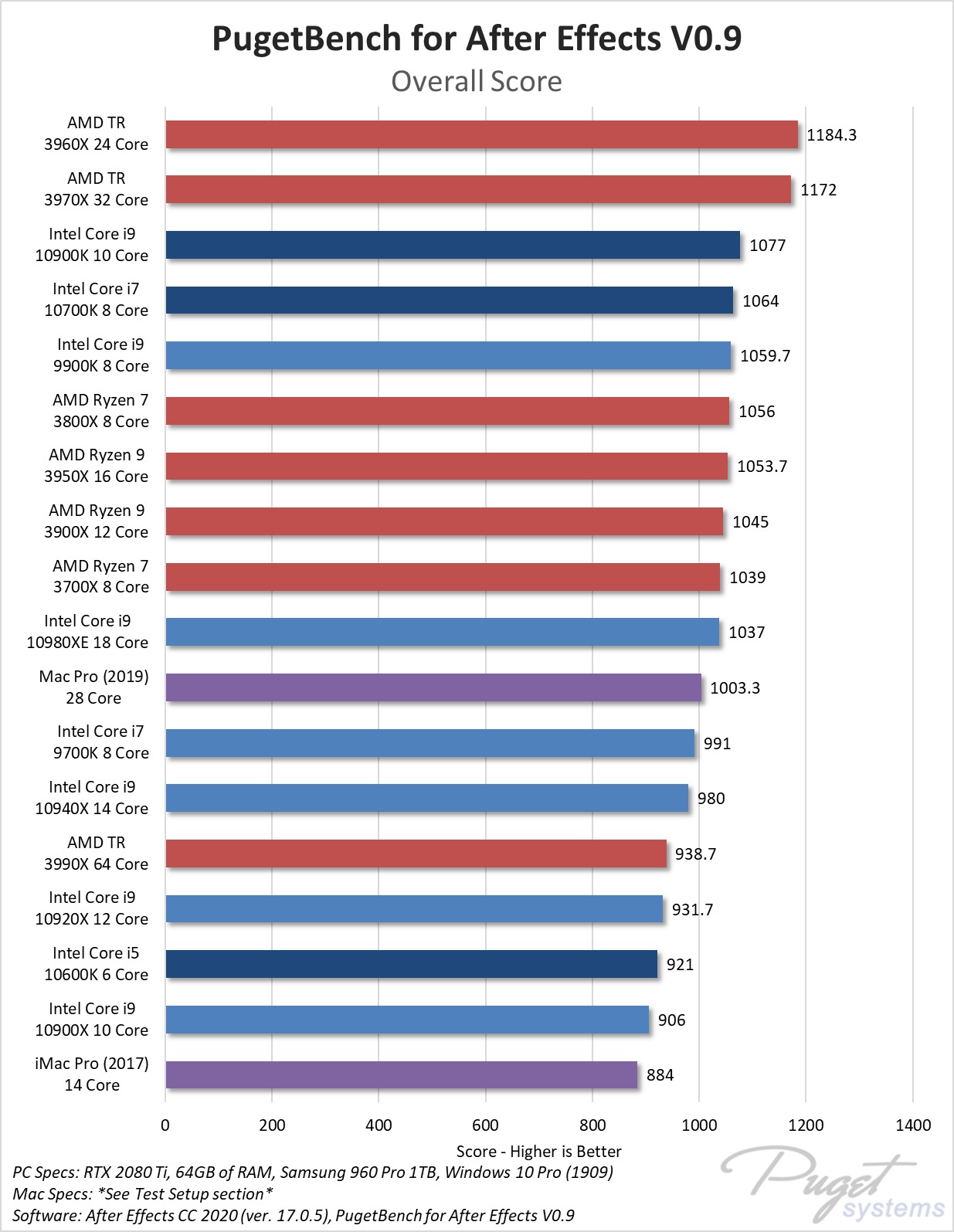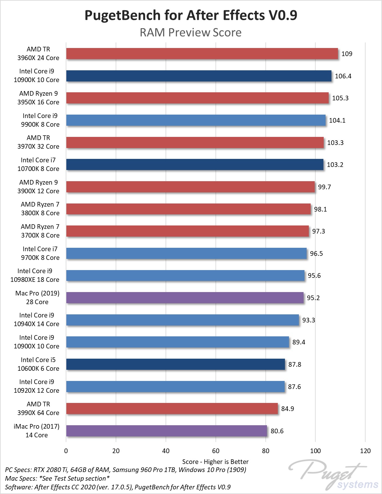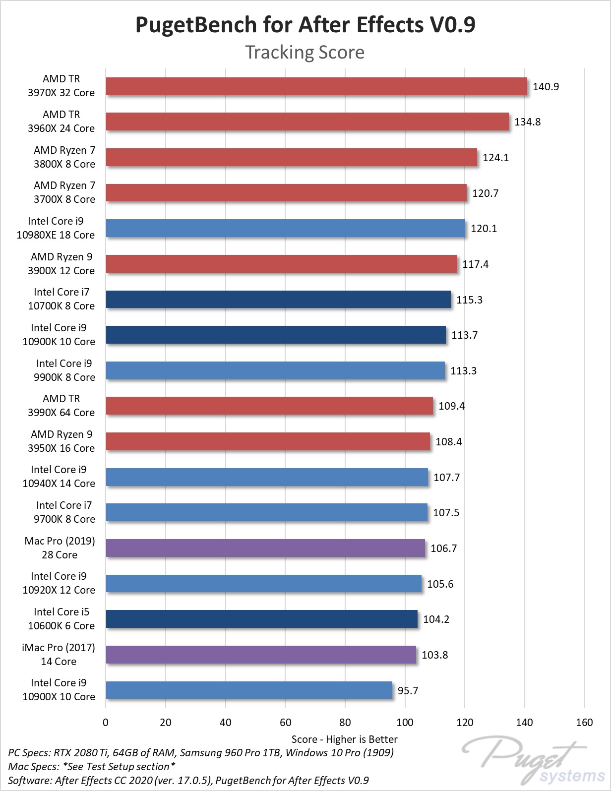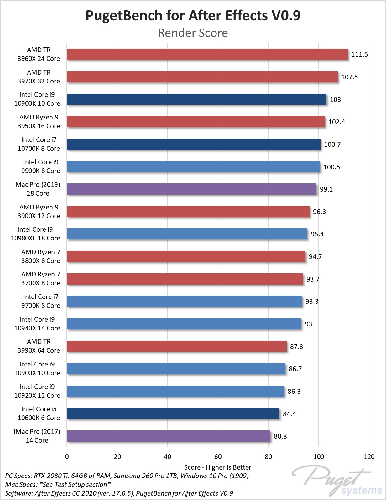 Um detalhe a ser observado, é que, devido ao impacto do COVID-19 no acesso ao hardware e às plataformas de teste, estão reutilizando os resultados da série Intel X, AMD Threadripper e Mac do artigo anterior After Effects: Desempenho do After Effects: PC Estação de trabalho vs Mac Pro (2019). A reutilização de resultados antigos é extremamente comum para as análises de hardware, embora normalmente a empresa refaça todos os testes para verificar se as versões mais recentes do BIOS, driver, atualização do Windows e aplicativos alteram os resultados. Nesse caso, no entanto, os testadores da Pugetsystems uniram um pouco dos resultados antigos e novos.