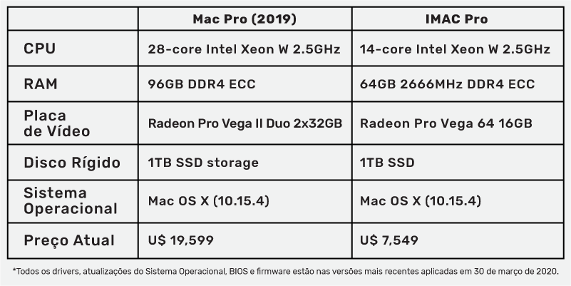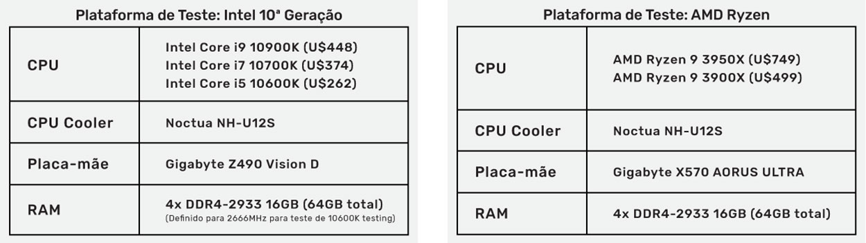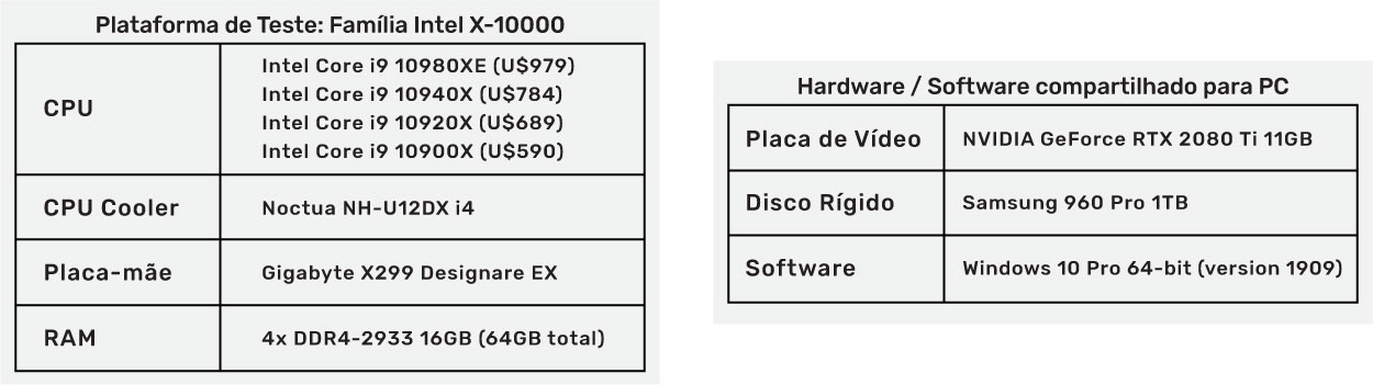 Abaixo estão listadas as especificações dos sistemas que a empresa PugetSystems utilizou nos testes: