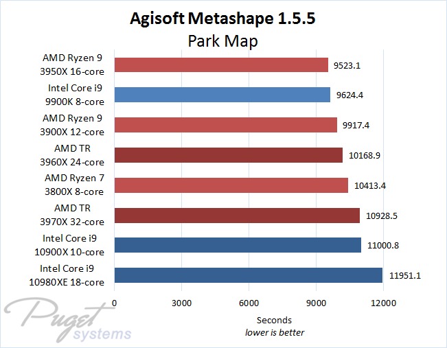 Dessa forma, se tivéssemos que selecionar um processador específico para obter o melhor desempenho e média geral entre esses aplicativos, seria o Ryzen 9 3950X da AMD. Assim, ele fornece velocidades consistentemente excelentes em aplicações de fotogrametria e, mesmo em situações em que os chips Threadripper avançam, ainda há um caso viável para fazê-lo do ponto de vista da relação preço / desempenho.