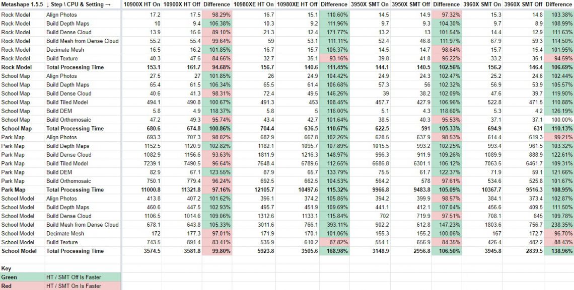 Além disso, parece que o Metashape simplesmente não funciona bem com contagens de threads acima de um determinado nível. Os testadores verificaram isso tentando desativar recursos como Hyperthreading (em chips Intel) e Multi-threading simultâneo (na AMD) e vendo que os modelos com alta contagem de núcleos ficam mais rápidos, enquanto os modelos com baixa contagem de núcleos ficam mais lentos: