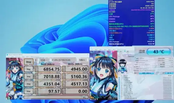 O SSD NVMe M.2 utilizado durante a demonstração foi o Samsung 980 Pro de 2TB. Além de alcançar uma média de temperatura de 10ºC, o desempenho também impressionou, atingindo uma taxa de transferência de dados de até 6,8GB/s. Dessa forma, a conexão próxima entre o SSD e o dissipador de calor da placa de vídeo garante que ambos os componentes sejam eficientemente resfriados, resultando em um desempenho estável e confiável.
