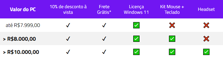 7.2 – Na compra de uma máquina acima de R$ 8.000,00 além do desconto de 10% à vista, frete grátis, licença Windows 11, você ainda ganha um Kit com Mouse e Teclado.