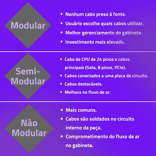 Quanto às fontes de computador, existem 3 tipos: modular, semi-modular e não modular, mas o que difere uma da outra?