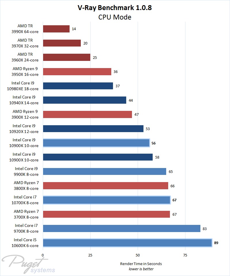 A Intel melhorou consideravelmente a performance de renderização quando se compara a sua geração anterior, com o Core i9 10900K estando na média 20% mais rápido no V-Ray do que o i9 9900k que está substituindo – e até rivalizando ou ganhando do Core X i9 10900X. Similarmente o novo Core i7 10700K vence o i7 9700K e se iguala ao i9 9900k com um preço menor.
