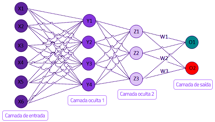 Camadas Ocultas: Entre a camada de entrada e a camada de saída, encontram-se as camadas ocultas, que são responsáveis por processar os dados e extrair padrões complexos. O número de camadas ocultas e de neurônios em cada camada pode variar, dependendo da complexidade da tarefa e da arquitetura da rede. Assim, cada neurônio em uma camada oculta aplica uma função de ativação, que introduz não-linearidade ao modelo, permitindo que a rede aprenda padrões mais sofisticados.